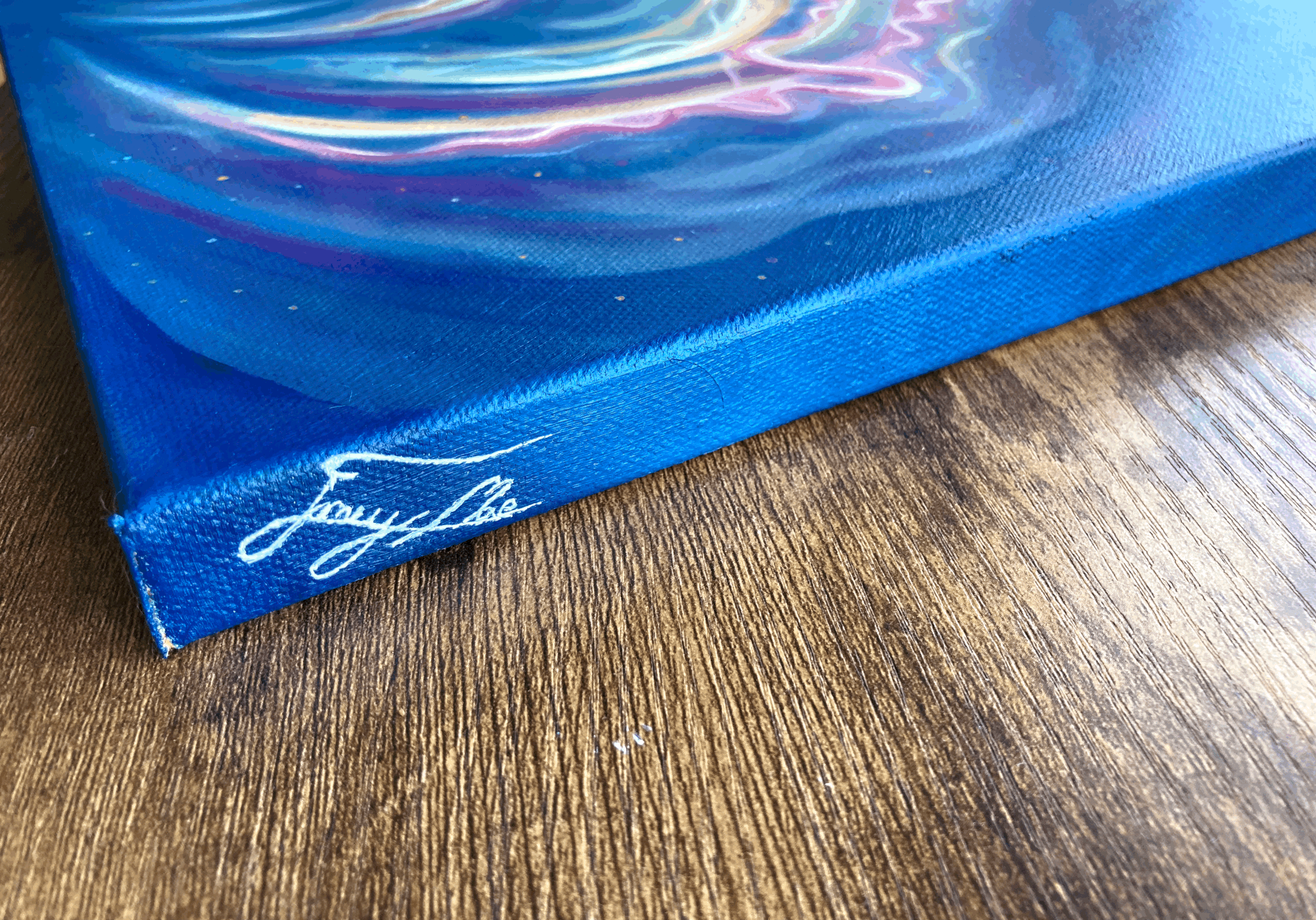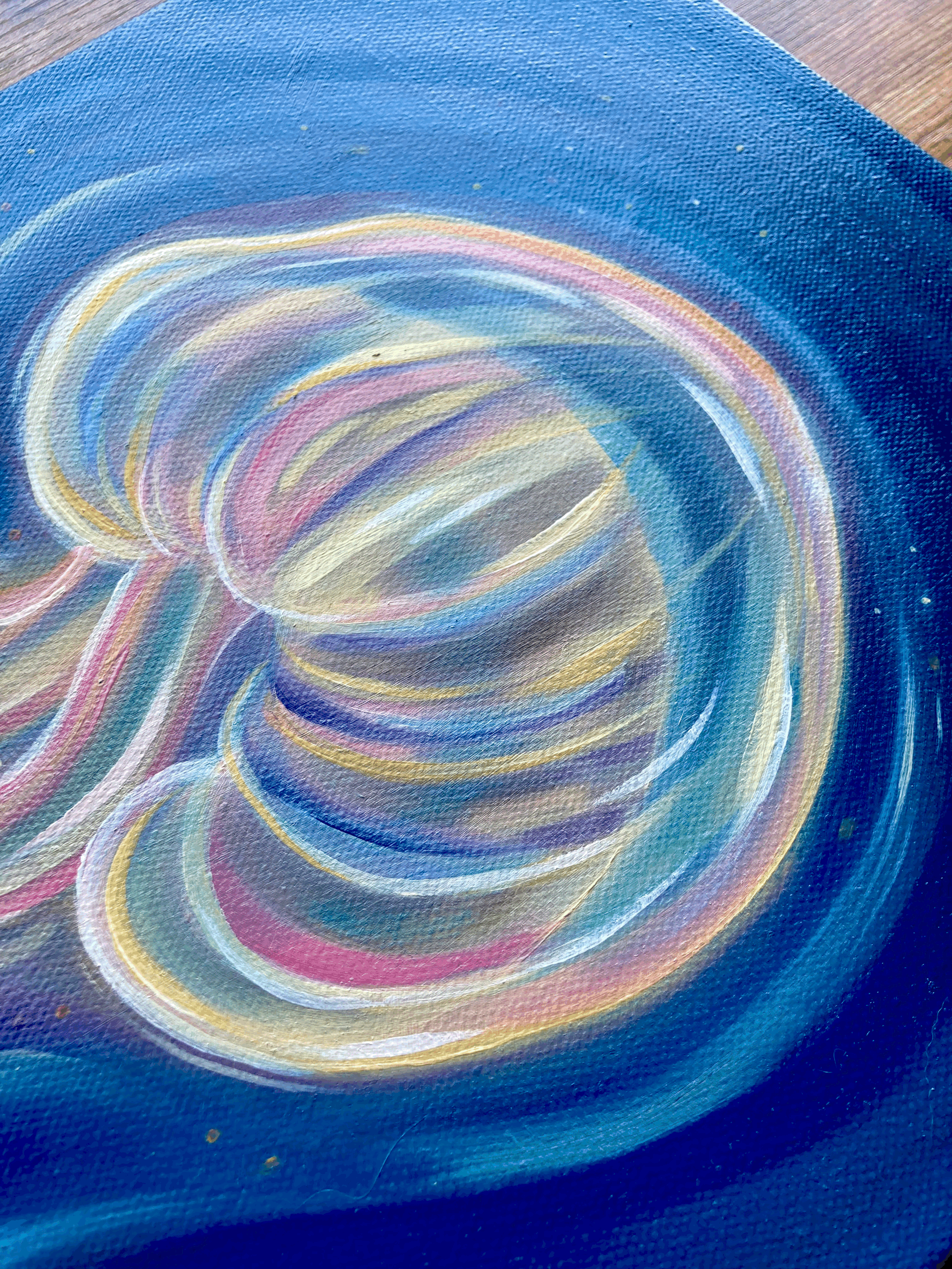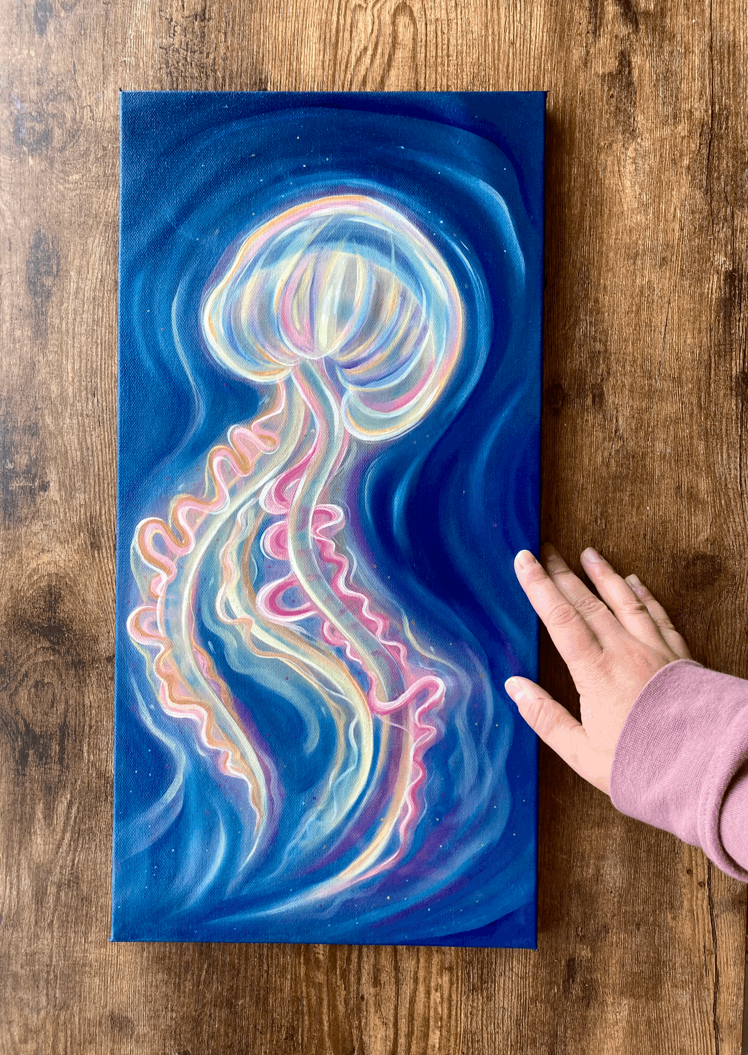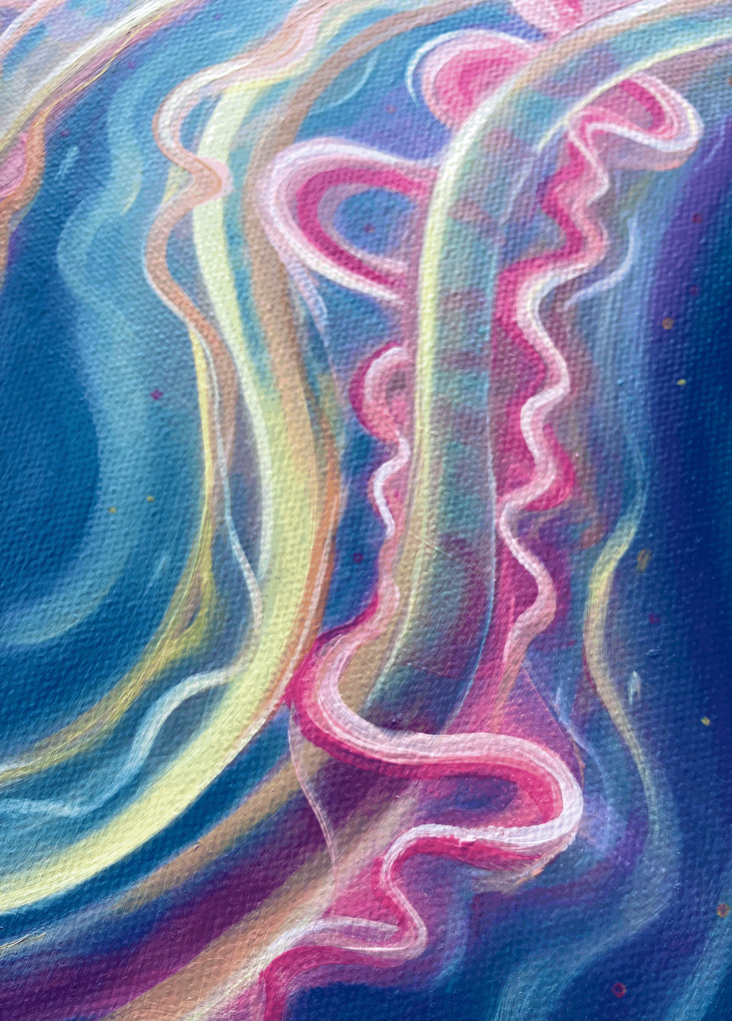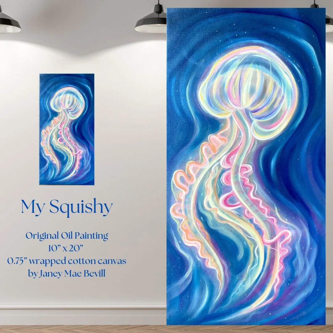 From the wall, this piece glows! You can feel the wispy wiggling of the tentacles and the lustous goo of the jellyfish body. This piece, titled “My Squishy,” began as an exploration in painting transparency. After layer upon layer of transparent yellow, magenta and ultramarine, this piece caught that elusive sense of transparency and with it a soft and calming movement. The further you look into this piece, the more depth, shimmers and textures can be found.